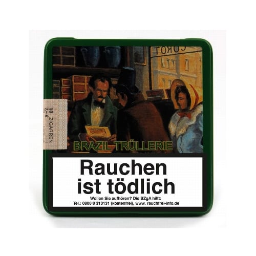 Любители сигарилл ценят сигариллы Brazil-Trüllerie Mini средней крепости. Высококачественные сигариллы марки Brazil-Trüllerie Mini – это короткие сигариллы машинного производства, изготовленные из 100% чистого табака. Изысканные сигариллы Brazil-Trüllerie Mini имеют темный натуральный покровный лист из табака Brazil Mata Fina. Наполнитель состоит из тщательно сбалансированной смеси отборных высококачественных табаков. В качестве связующего листа используется бразильский табак. Короткие сигариллы Brazil-Trüllerie Mini обладают сладким, пряным ароматом и насыщенным удовольствием от курения. Декоративная жестяная коробка с художественным мотивом содержит 10 сигарилл Brazil-Trüllerie Mini. Длина: 92 мм. Диаметр: 9 мм. Покровный лист: натуральный, темный. Количество: 10 сигарилл.