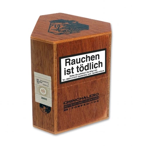 Chinchalero Torpedito – это сигары средней крепости формата Petit Torpedo. Эти привлекательные по цене сигары бренда Chinchalero Torpedito Petit Torpedo – это длинные сигары ручной работы, изготовленные из 100% чистого табака. Прочные сигары Chinchalero Torpedito имеют лёгкий натуральный покровный лист Connecticut Shade из Эквадора. Наполнитель состоит из тщательно отобранных премиальных табаков из лучших регионов выращивания Никарагуа и Гондураса. Для связующего листа используется высококачественный табачный лист из Гондураса. Сигары Chinchalero Torpedito средней длины с конической чашей отличаются умеренным содержанием никотина, приятной тягой и очень хорошим горением. При курении раскрывается тонкое, пряное сочетание ароматов с преобладанием ореховых и древесных нот. Однако в аромате также присутствуют отчётливые травянистые, перечные и фруктовые тона, нотки кожи и земли, а также лёгкие жареные нюансы. Гармонично сбалансированный табачный букет становится немного интенсивнее по мере курения. Удовольствие от курения сбалансированное, мягкое, гладкое и сливочное. Поэтому эти изящные сигары с их компактным силуэтом подойдут как постоянным, так и нерегулярным курильщикам сигар. Треугольная деревянная коробка содержит 25 сигар Chinchalero Torpedito Petit Torpedo. Длина: 12,7 см / 5 дюймов Диаметр: 1,7 см / калибр кольца 43 Время курения: около 60 минут Аромат: нет Способ производства: длинный наполнитель, полностью ручная работа Страна происхождения: Никарагуа, Гондурас Покровный лист: натуральный, светлый, Эквадор Коннектикут Цветовая гамма: 25 сигар