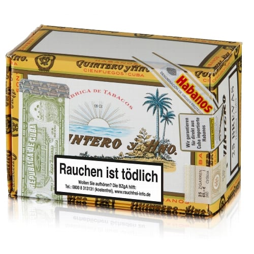 Quintero Brevas — это сигары средней крепости и крепкие в удобном формате Corona. Сигары марки Quintero Brevas Corona по привлекательной цене скручены вручную из 100% чистого табака. Тщательно производимые с 1924 года в южном городе Сьенфуэго, Куба, сигары Quintero Brevas имеют круглую головку и натуральный покровный лист кофейно-коричневого цвета. Высококачественная смесь наполнителя состоит из более крупных кусочков табачных листьев. Табаки для покровного, связующего и наполнителя поставляются из табачных регионов Вуэльта-Абахо и Семи-Вуэльта. Сигары Quintero Brevas средней длины в формате Corona отличаются высоким содержанием никотина, идеальной стойкостью тяги, плотным развитием дыма, равномерным горением и широким спектром ароматов. Табачный вкус этих пурос хорошо сбалансированный, пряный и крепкий. Преобладают землистые, древесные, кожаные и перечные ноты. Временами ощущаются оттенки кофе, темного шоколада и орехов, травянистые и фруктовые ноты, изысканные жареные акценты и легкая сладость. Удовольствие от курения насыщенное и сливочное. Длительное хранение сигар Quintero Brevas в хьюмидоре положительно влияет на раскрытие вкуса. Насыщенные сигары Quintero Brevas подходят как для постоянных, так и для нерегулярных курильщиков благодаря своей крепости и простому формату. Прочная картонная коробка содержит 25 сигар Quintero Brevas, упакованных в фольгу. Длина: 14 см / 5,5 дюйма Диаметр: 1,6 см / калибр 40 Время курения: около 50 минут Аромат: отсутствует Способ производства: средняя начинка, ручная скрутка Страна происхождения: Куба Покровный лист: натуральный, кофейно-коричневый Вместимость: 25 сигар